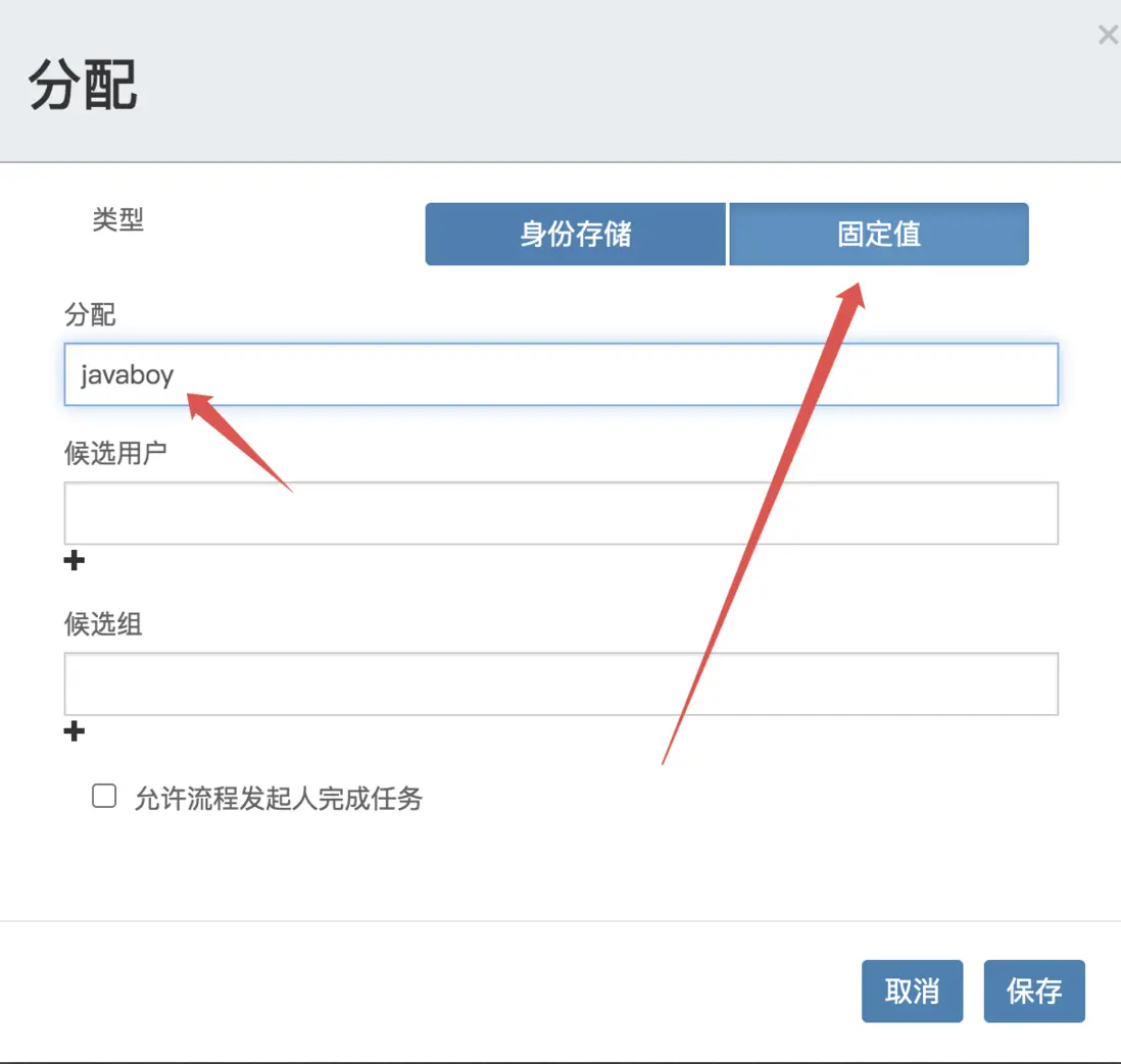 然後在打開的窗口中選擇固定值,設置具體分配的用户是 javaboy,如下圖: