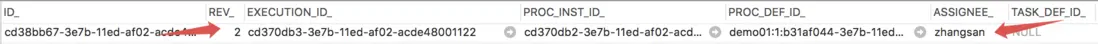 這行代碼執行完成後,我們看數據庫中的 ACT_RU_TASK 表,還是剛才那條記錄,但是處理人變了,變成了 zhangsan: