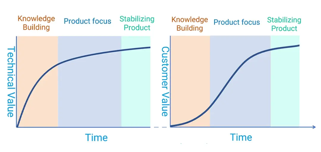 David Theil 根據階段性目標的不同,將產品生命週期劃分為知識構建期、產品成長期和穩定增長期,並繪製了技術價值和用户價值的增長曲線。