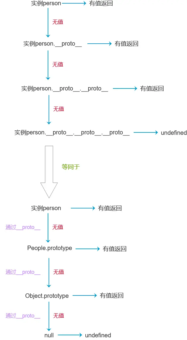 當我們用構造函數People實例化了一個對象person後,訪問person的方法或者屬性時,會先在實例person自身找有沒有對應的方法屬性。有值的話,則返回值,沒有的話則去person.__proto__(People.prototype)裏找;有值的話,則返回值,沒有的話,又會去People.prototype.__proto__(Object.prototype)裏找。有值的話,則返回值;沒有的話,又會去Object.prototype._proto__裏找,但是Object.prototype.__proto__返回null,原型鏈到頂,一條條原型鏈搜索完畢,都沒有,則返回undefined。