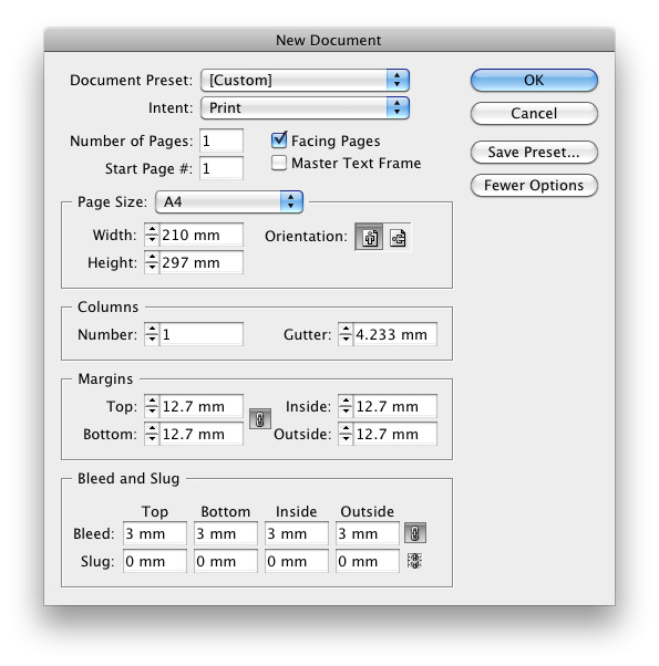 If you are preparing a document for print, keep your margins and bleeds in mind from the beginning. Your printer will give you the measurements for the bleed, but generally 1⁄8 inch or 3 mm should suffice. Approximately the same area within the document should be kept free of text and important graphic elements (such as the logo). Set up your document for bleed in InDesign as you create it by selecting the correct settings in the document set-up box.