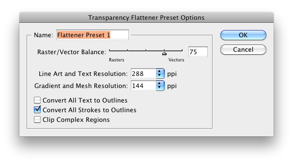 In most cases, the “High Resolution” setting will suffice. You can make sure this preset is used when exporting to PDF by going to File → Export, selecting PDF and then clicking on the “Advanced” tab. You can now set the “Transparency Flattener” option to “High Resolution” by default.