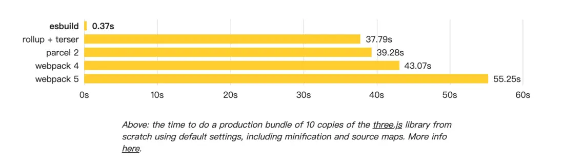 上面多次提到了esbuild,esbuild使用 go 語言編寫,所以在 i/o 和運算運行速度上比解釋性語言 NodeJs 快得多,esbuild 號稱速度是 node 寫的其他工具的 10~100 倍。