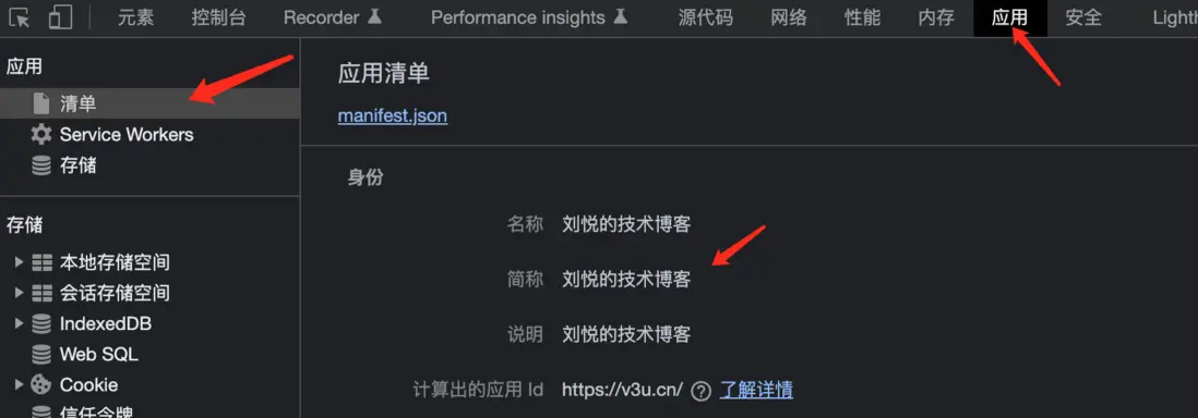 在Chrome 的應用標籤下進行檢查,看應用清單有沒有讀出你的 PWA 應用信息配置文件: