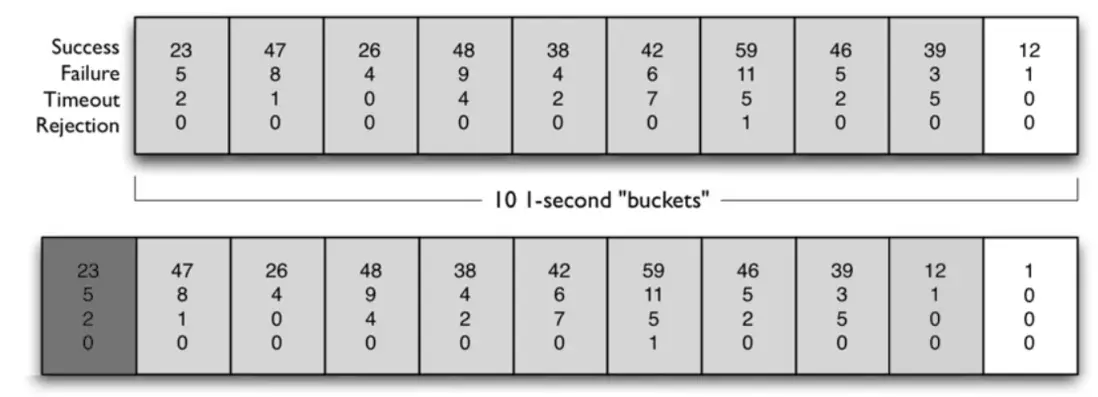 假設:準備觀察的時間片段為 10 秒,以 1 秒作為統計精度,那可以得到一個長度為 10 的數組。設定限流閾值是最近 10 秒內收到的請求不超過 500 個,那麼就需要統計10個子數組的請求總數,是否超過閾值。