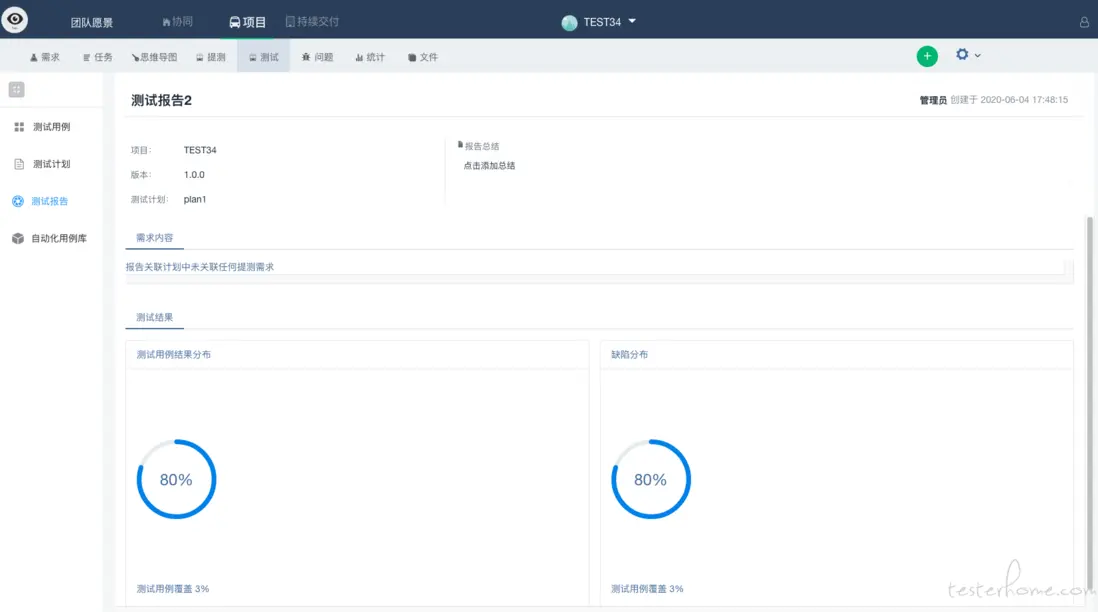 - 測試報告和質量度量:TeamVision自動生成測試報告,對測試結果進行彙總和分析,從而幫助團隊瞭解軟件質量狀況,並採取相應措施進行改進。