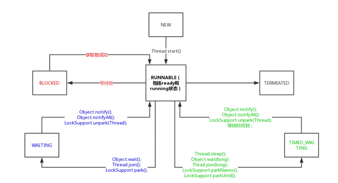 當線程調用Object.wait()、Thread.join()或者LockSupport.park()等方法後,主動放棄當前持有的鎖並進入WAITING狀態,此時線程必須由其他線程通過notify()、notifyAll()或LockSupport.unpark()方法喚醒才能恢復到RUNNABLE狀態。