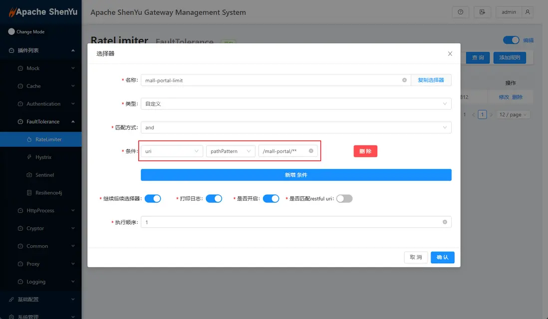 插件列表->FaultTolerance->RateLimiter中添加好選擇器,這裏我們對mall-portal中的所有API都進行了限流;