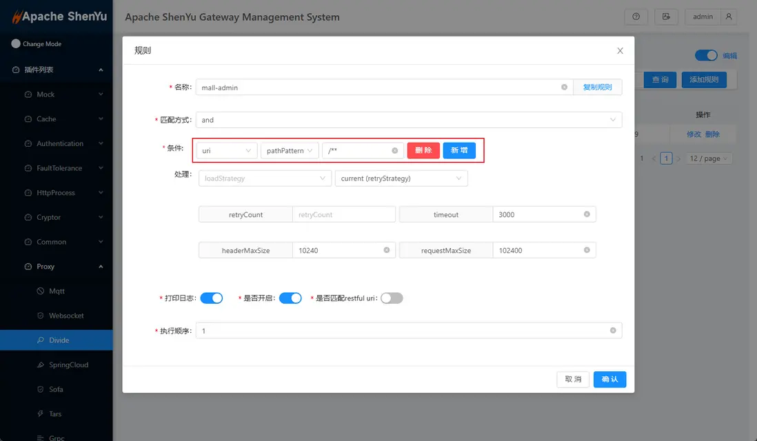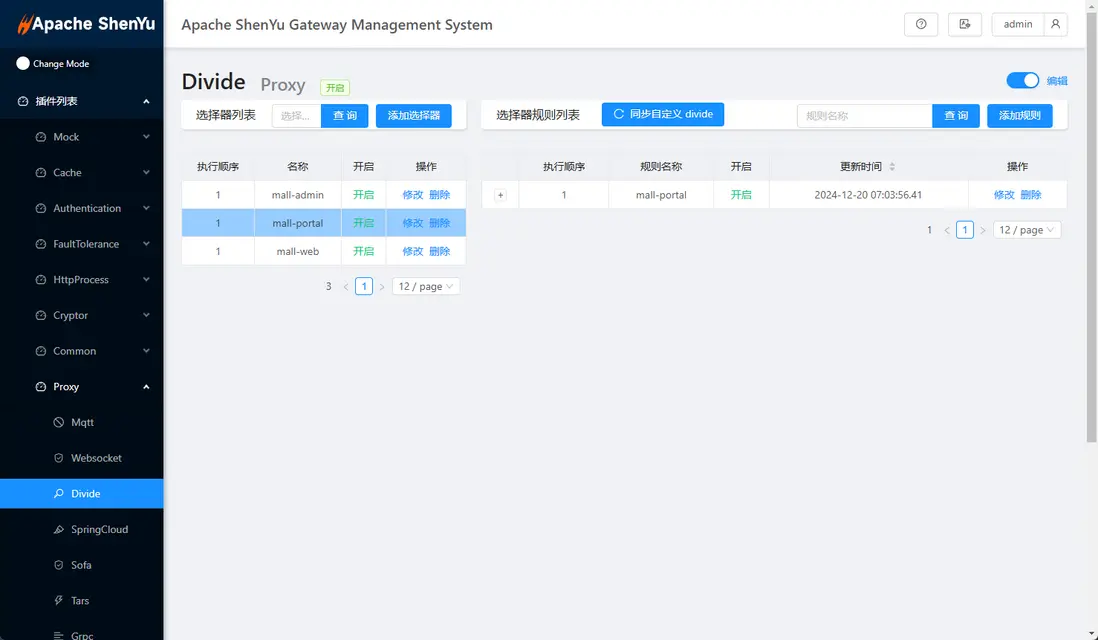 插件列表->Proxy->Divide功能中先添加選擇器,這裏以mall-admin為例,首先是基本配置;