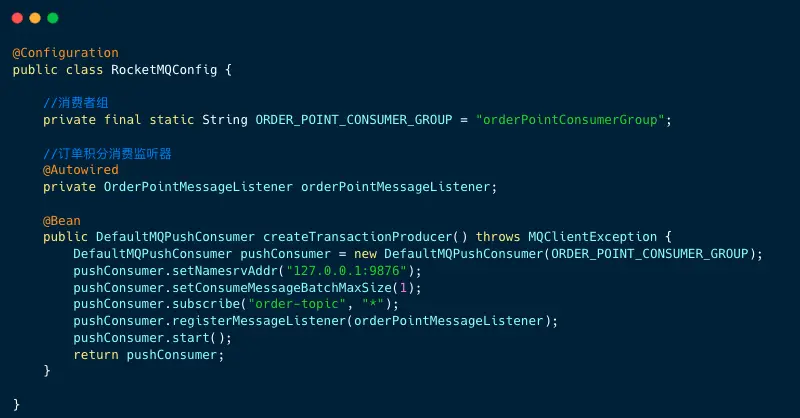 積分消費者服務,我們定義了消費者組名,以及訂閲主題和消費監聽器。