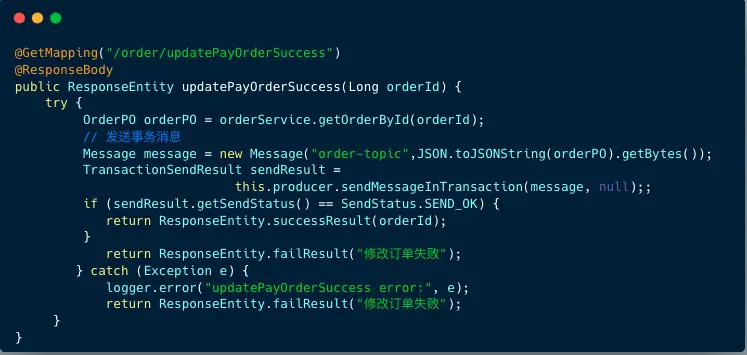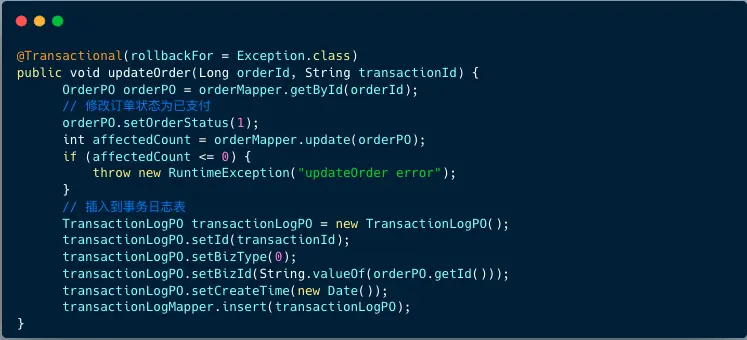 需要注意的是: orderService.updateOrder 方法添加了事務註解,並將修改訂單狀態和插入事務日誌表放進一個事務內,避免訂單狀態和事務日誌表的數據不一致。