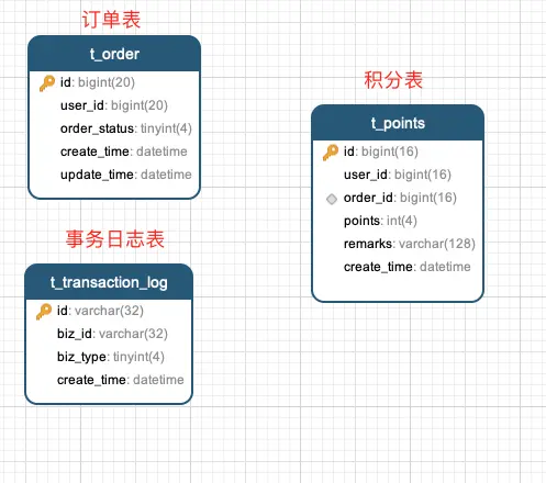 然後在數據庫中創建三張表 訂單表、事務日誌表、積分表。