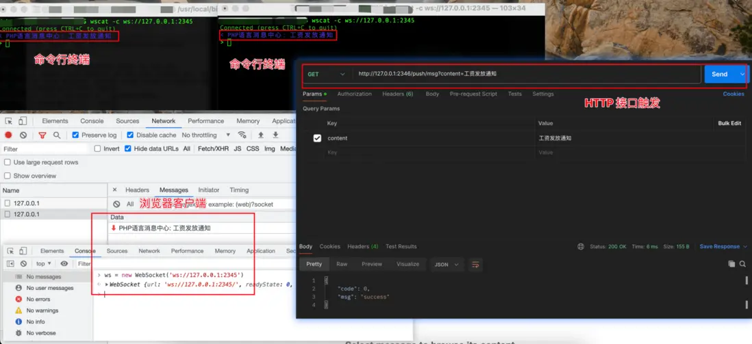 先運行 php think worker 啓動 HTTP 服務,再運行 php think worker:server 啓動 WebSocket 服務,最後來測試一波。
