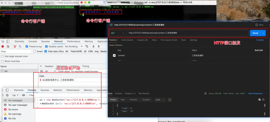 運行 go run main.go 啓動服務,然後進行消息推送測試。