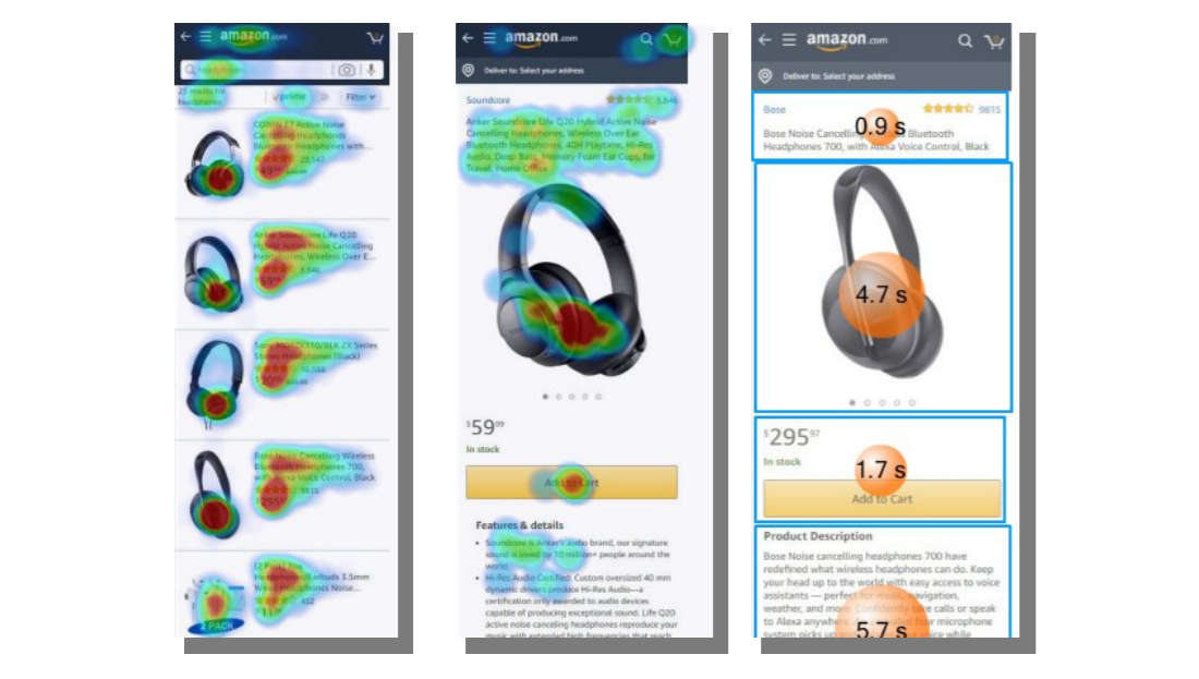 This was true even though the researched product was listed as fourth in the online shopping platform, demonstrating that the advertisement contributes to getting the customers’ attention. In addition to receiving longer viewing times overall, customers of the Eye Square and Oculid study showed 50% more interactions/clicks with the advertised product than with any other competing product. For UX teams, this study showcases how measuring visual attention can give information about patterns that people follow when accessing a website or an app.