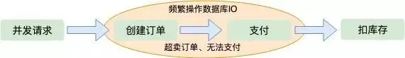如果等待用户支付了訂單在減庫存,第一感覺就是不會少賣。但是這是併發架構的大忌,因為在極限併發情況下,用户可能會創建很多訂單,當庫存減為零的時候很多用户發現搶到的訂單支付不了了,這也就是所謂的 “超賣”。也不能避免併發操作數據庫磁盤 IO
