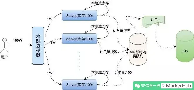 這樣就避免了對數據庫頻繁的 IO 操作,只在內存中做運算,極大的提高了單機抗併發的能力。但是百萬的用户請求量單機是無論如何也抗不住的,雖然 nginx 處理網絡請求使用 epoll 模型,c10k 的問題在業界早已得到了解決。但是 linux 系統下,一切資源皆文件,網絡請求也是這樣,大量的文件描述符會使操作系統瞬間失去響應。上面我們提到了 nginx 的加權均衡策略,我們不妨假設將 100W 的用户請求量平均均衡到 100 台服務器上,這樣單機所承受的併發量就小了很多。然後我們每台機器本地庫存 100 張火車票,100 台服務器上的總庫存還是 1 萬,這樣保證了庫存訂單不超賣, 下面是我們描述的集羣架構: