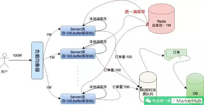 問題接踵而至,在高併發情況下,現在我們還無法保證系統的高可用,假如這 100 台服務器上有兩三台機器因為扛不住併發的流量或者其他的原因宕機了。那麼這些服務器上的訂單就賣不出去了,這就造成了訂單的少賣。要解決這個問題,我們需要對總訂單量做統一的管理,這就是接下來的容錯方案。服務器不僅要在本地減庫存,另外要遠程統一減庫存。有了遠程統一減庫存的操作,我們就可以根據機器負載情況,為每台機器分配一些多餘的 “buffer 庫存” 用來防止機器中有機器宕機的情況。我們結合下面架構圖具體分析一下: