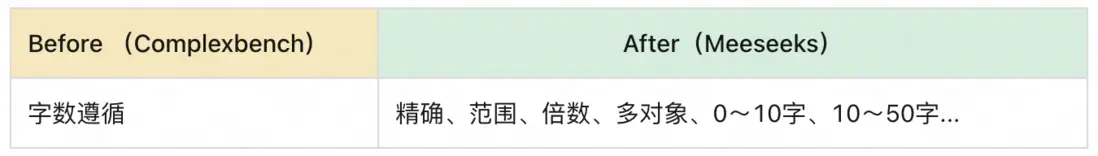 其次是 評測粒度更細,它將單一約束拆解得更為精細,如將“字數遵循”細分為精確值、範圍、倍數等多種情況,實現了對模型能力的精準畫像。