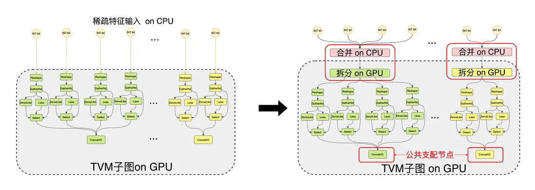 TVM優化後的子圖被替換為一個節點,該節點在GPU上執行,通常有幾十甚至幾百個輸入,該節點的前置輸入(如Placeholder)通常是在CPU上執行,會涉及多次的CPU-GPU傳輸。頻繁的小數據量傳輸,無法充分利用帶寬。為了解決這個問題,我們對模型結構進行修改,在計算圖中添加合併與拆分節點,控制切圖的位置,減少數據傳輸的次數。