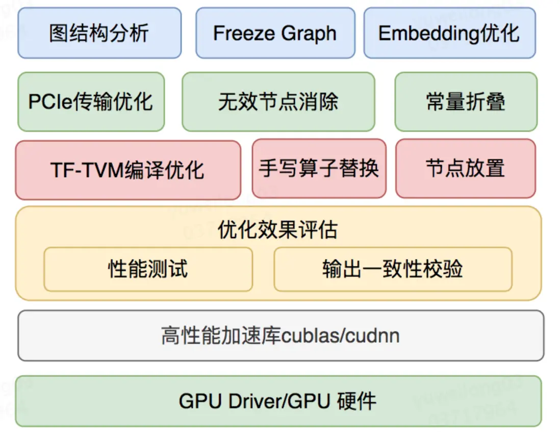 - 框架層面:TensorFlow和PyTorch本質都是訓練框架,對算法開發者比較友好,但非部署友好。其中隱含了很多為了方便分佈式訓練做的設計,比如TensorFlow為了方便將Variable拆到不同的PS上,內置了Partitioned_Variable的設計。在基於GPU單機預測的場景下,這些結構也會帶來額外的開銷。