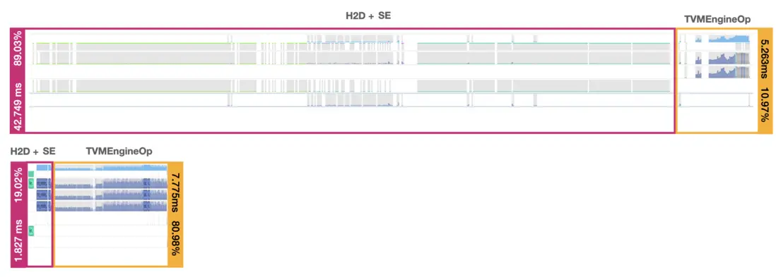 GPU Scan算法示意,一個8個元素的前綴和操作,只需要3個迭代週期。在一個有幾十路類似操作的模型中,手工優化前後的GPU timeline對比如下圖,可以看到H2D + StringEmbedding這部分結構的耗時有很大的縮減,從42毫秒縮減到1.83毫秒。