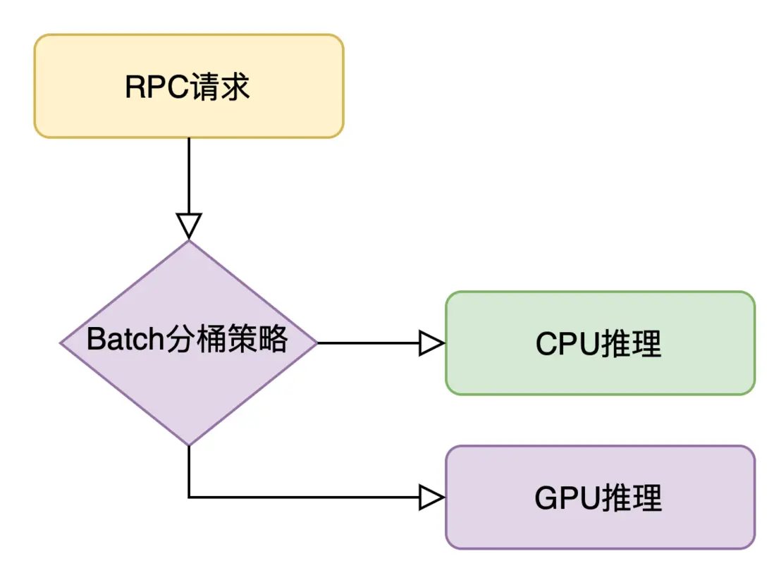 大部分請求都由GPU在做了,CPU資源有較多空餘,我們將一些小Batch的碎請求放在CPU運行,這樣可以讓整個Worker的資源利用更加均衡,提高系統整體的性能。我們根據測試設定了一個Batch閾值,以及計算圖在異構硬件上區別執行的判斷邏輯:對於小Batch的情況,直接在CPU上執行計算圖,只有Batch超過閾值的請求才會在GPU上推理。從線上的統計數據來看,整體流量的77%跑在GPU上,23%跑在CPU上。