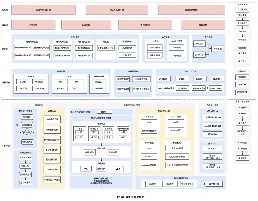 在上述實驗流程中,不難看出,即使沒有複雜的實驗背景與專家知識的實驗者也可零門檻自主運行可信實驗。這不僅歸功於數據科學家前置制定實驗模板,還得益於構建了體系化的實驗分析引擎,為用户提供標準化的流程和多樣化的方法,並幫助用户避開各類實驗陷阱。分析引擎作為一箇中心方法庫,整合了數科同學的所有優秀的實踐,並涵蓋學業界絕大部分實驗方法。同時分析引擎也旨在促進知識共享,它可以像“積木”一樣接入各種實驗平台,服務不同角色的用户。對於具有專家級統計理解的用户,可以提供原子化工具組件,幫助他們在業務場景約束下綜合權衡偏差和方差,制定適合其業務場景的實驗方案。對於普通用户,可以使用實驗平台,輕鬆避開各類實驗陷阱並輸出實驗報告,零門檻運行可信實驗。