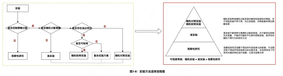 考慮到各類評估方法的複雜度和準確性上各有千秋,我們基於實驗理論與實踐經驗,沉澱了一套大體的實驗方法選擇流程圖,如圖1-6所示,總體而言從可信度等級上優先選擇隨機實驗(包括隨機對照實驗和隨機輪轉實驗),其次是準實驗,最後是觀察性研究。
