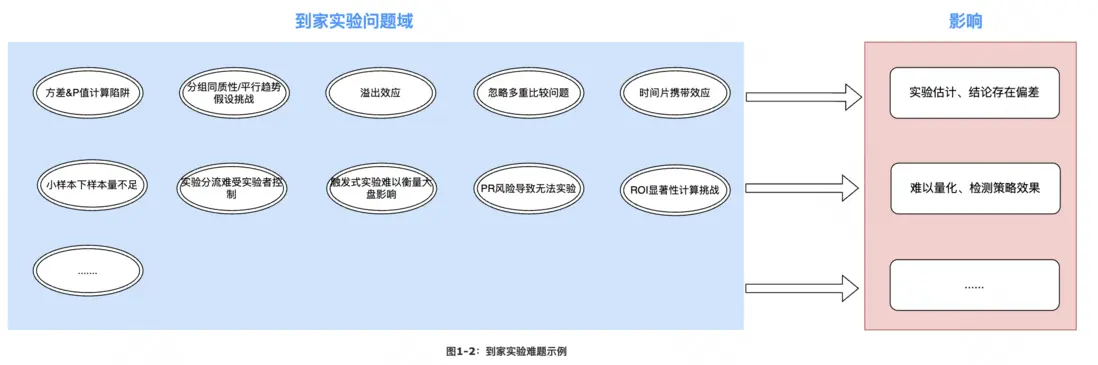 以美團到家業務實驗為例,如圖1-2所示,實驗者可能會經常面臨各種各樣複雜的陷阱與挑戰,處理稍有不當則可能損失實驗的可信度,甚至帶來錯誤的實驗結論。