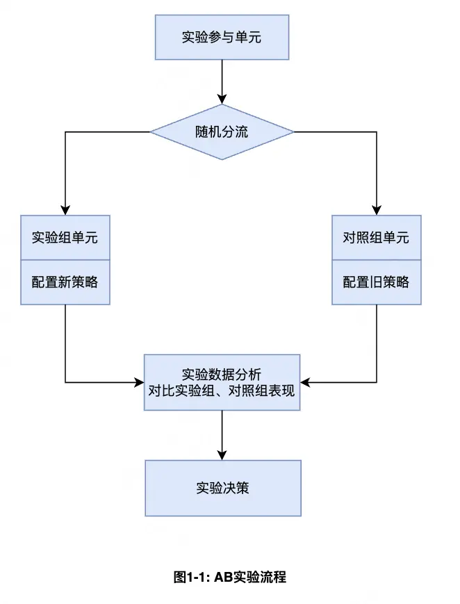 假設美團履約側在可為某些(用户,商家)提供配送服務時,想驗證在App的C端產品上彈窗以及展示某標籤是否能促進用户下單意願。此時,AB實驗提供了理想的解決方案。如圖1-1所示,其做法為通過圈選一部分用户並隨機分配為實驗組和對照組(隨機分流可確保兩組在諸多特徵上無差異),實驗組用户施加新功能/新版本策略,而對照組用户繼續使用舊功能/舊版本策略。一段實驗週期後基於日誌系統和業務系統收集的用户指標數據進行分析,比較實驗策略與對照策略是否有顯著收益,並以此為依據判斷新策略是否應推廣到全部用户。