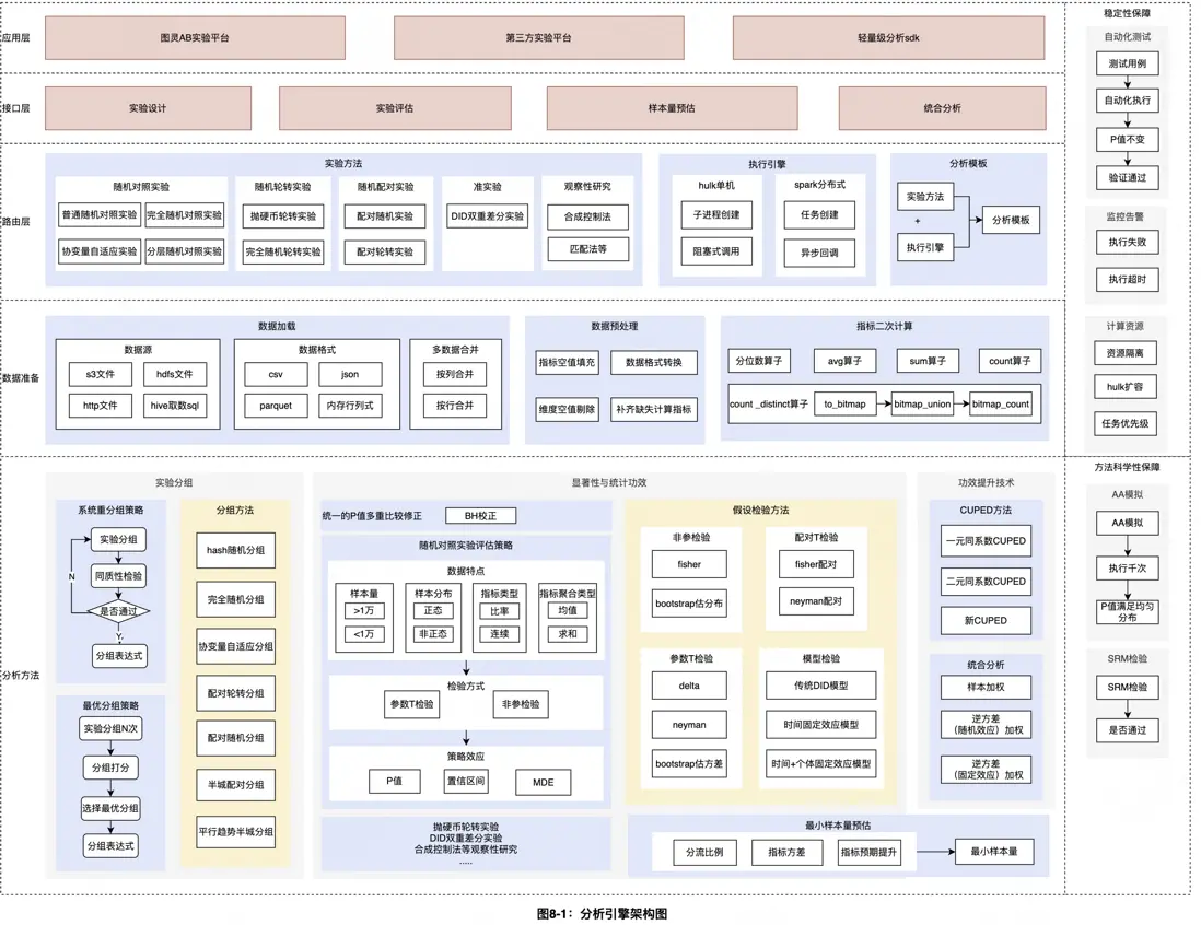 如圖8-1所示,分析引擎提供標準化的分析流程以及多樣化方法,採用模塊化和分層設計原則來提升實驗方法的迭代、拓展效率,以及實現像積木一樣靈活應用,服務不同角色的用户。具體每層作用如下: