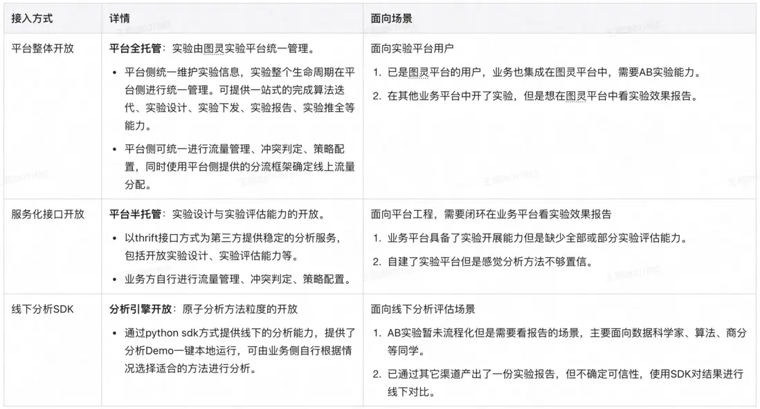 作為核心分析方法庫,當前分析引擎已面向美團內部全體成員開放,並提供多種接入途徑,方便實驗者自行根據自身場景選擇最佳實驗接入方式。