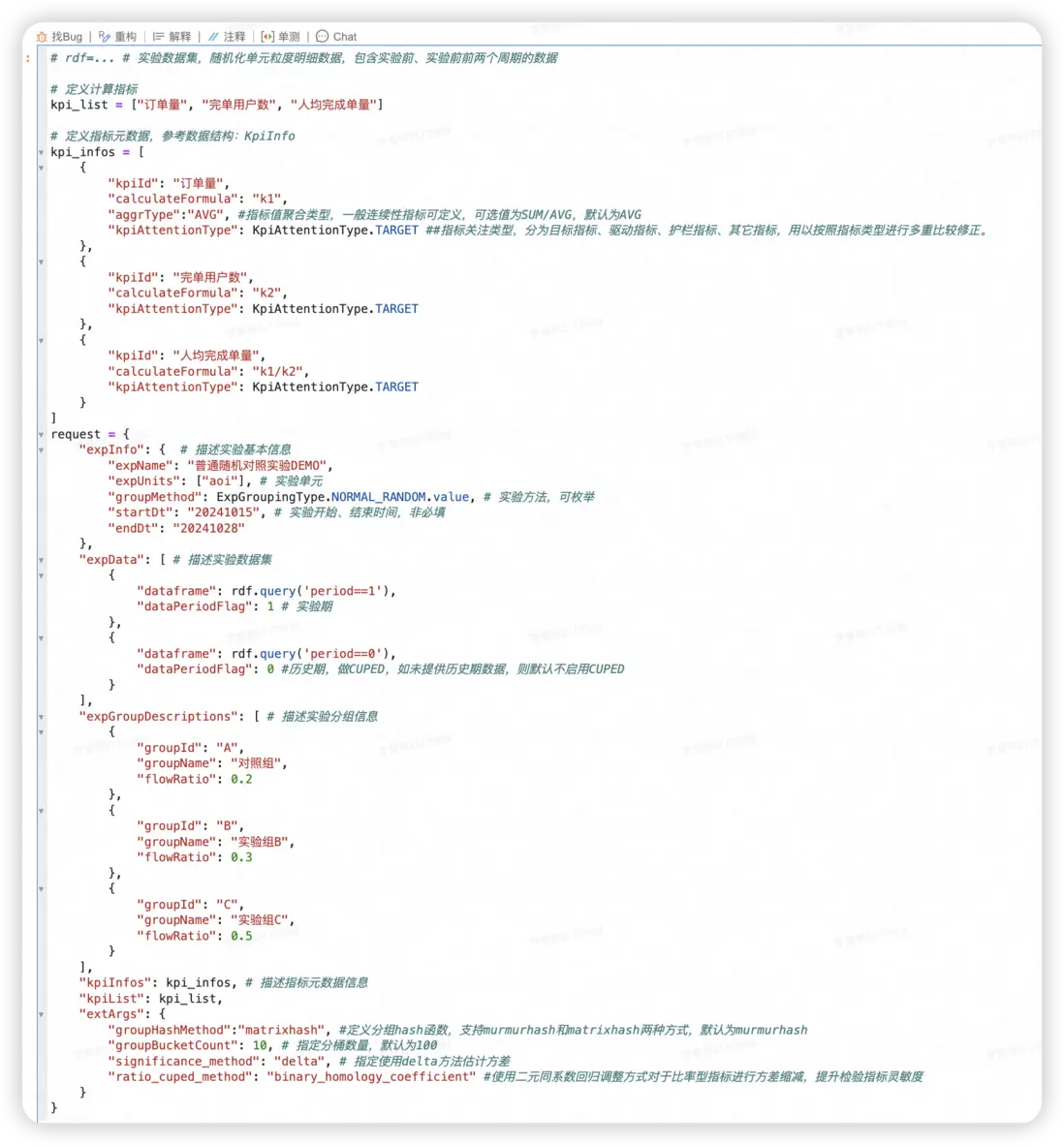 - 通過定義數據集、實驗分組、分析指標等信息來構造分析請求,請求參數對應於數據結構[AnalyzeRequest]。