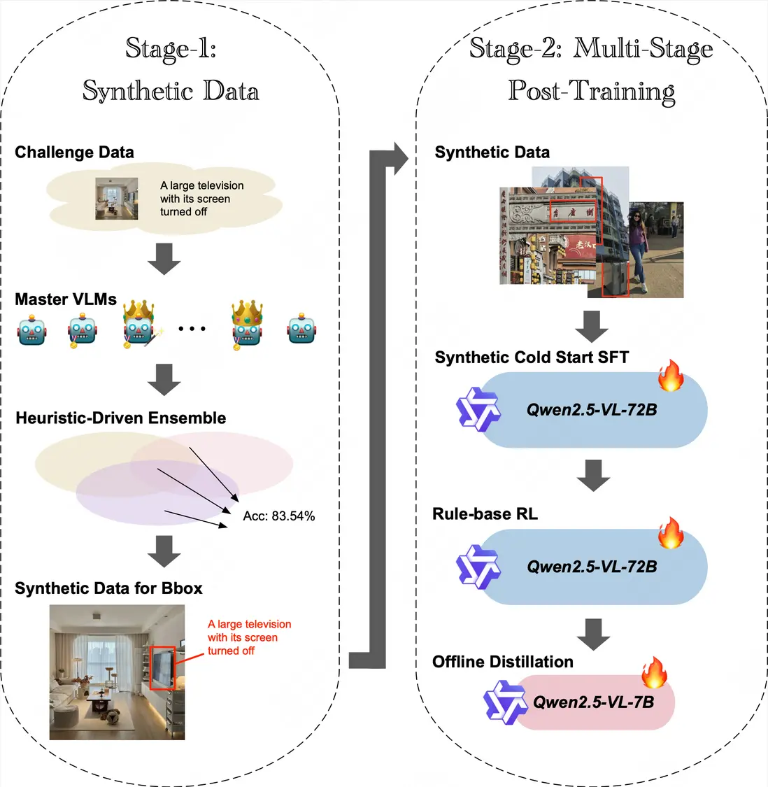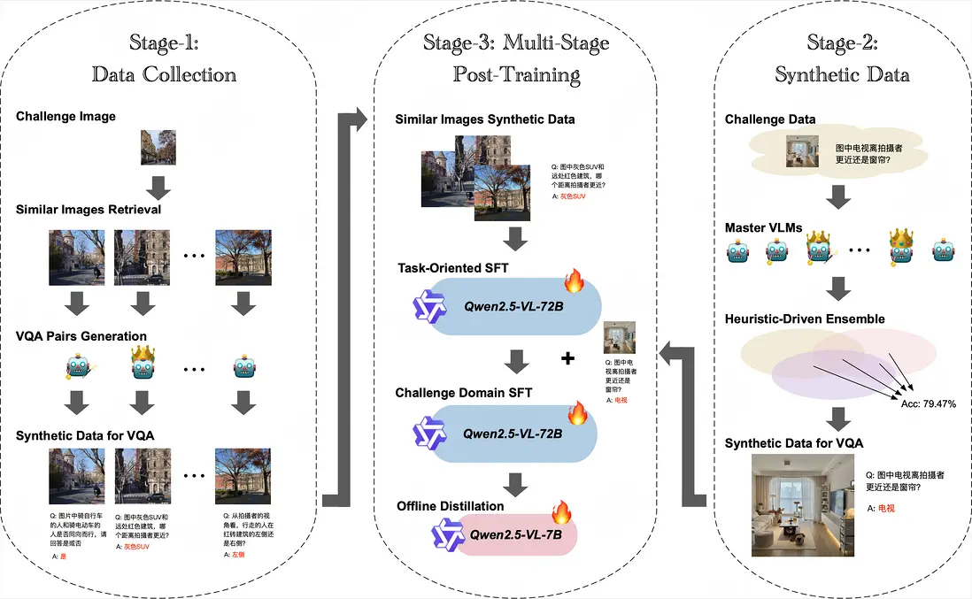 - 接着在無答案比賽數據集上,我們進一步精調多個SOTA模型prompt,並以集成方式合成出少量高置信的比賽數據樣本,之後使用這批合成數據對Qwen2.5-VL-72B-Instruct進行第二階段SFT,進一步提升了模型在比賽數據上的表現;