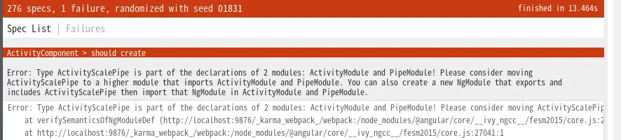 查看後發現ActivityScalePipe在新建時聲明在了Activity模塊中,而我想在view模塊中使用,就又將管道聲明在了view模塊中,這樣就導致了上面的問題。最開始想到的解決辦法時在view不用聲明管道,在Activity中export ActivityScalePipe,然後在view模塊中引入Activity模塊,結果導致產生循環,因為在Activity模塊中已經引入了view模塊。後來直接將管道聲明在view模塊中,然後再export管道,問題解決。