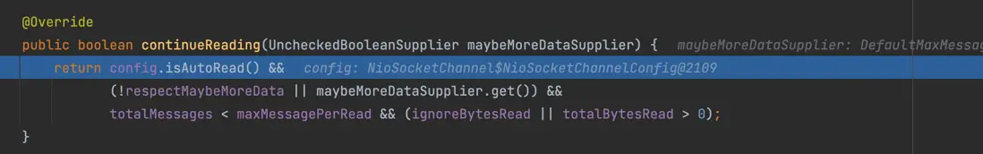 進入該方法,totalMessages是循環讀取次數,每循環一次加1,maxMessagePerRead=16,這裏表示最大允許循環16讀取,防止一個線程一直讀,給其他線程讓出機會。