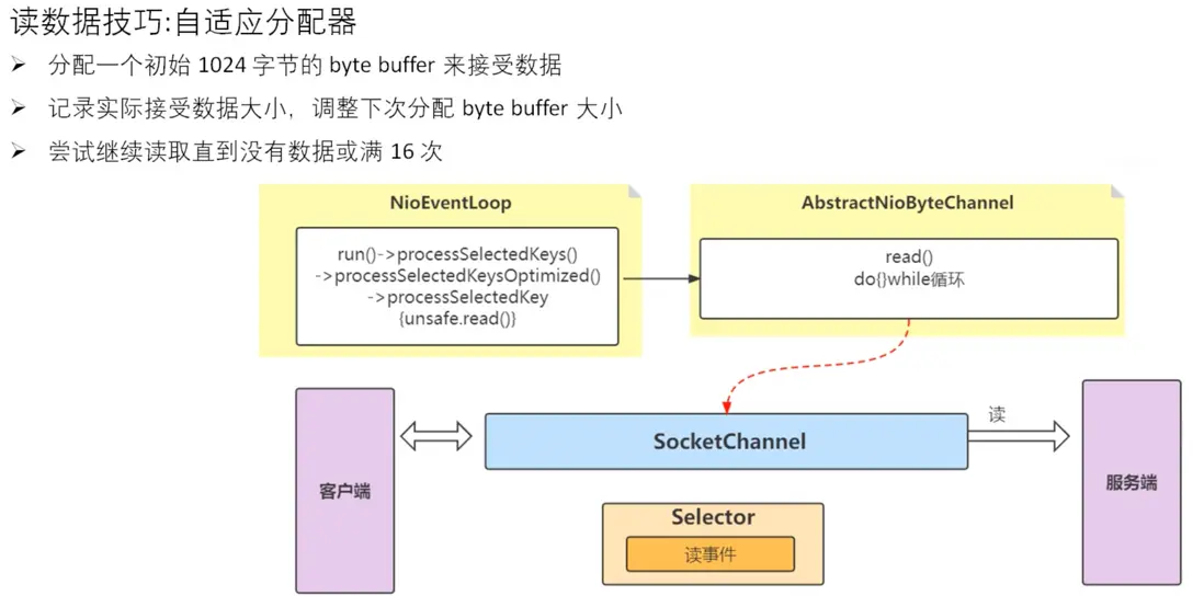 1、讀數據通過自適應buffer來讀取,根據讀取數據的大小調整buffer大小,加快讀取速度