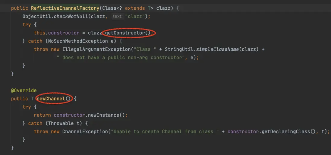 Netty通過channel的反射工廠獲取channel的構造器,channel類型通過參數傳遞(這裏實現對不同類型IO的支持),channel通過反射工廠在需要的時候構造出來(這裏是一個優化)。