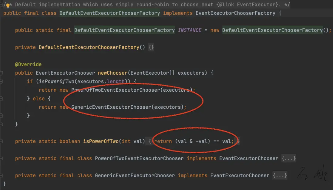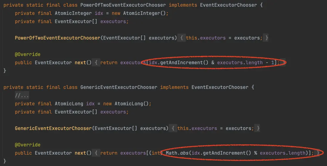 該方法來自於接口EventExecutorChooserFactory.EventExecutorChooser,有兩個實現類GenericEventExecutorChooser和PowerOfTwoEventExecutorChooser,都是在DefaultEventExecutorChooserFactory中。