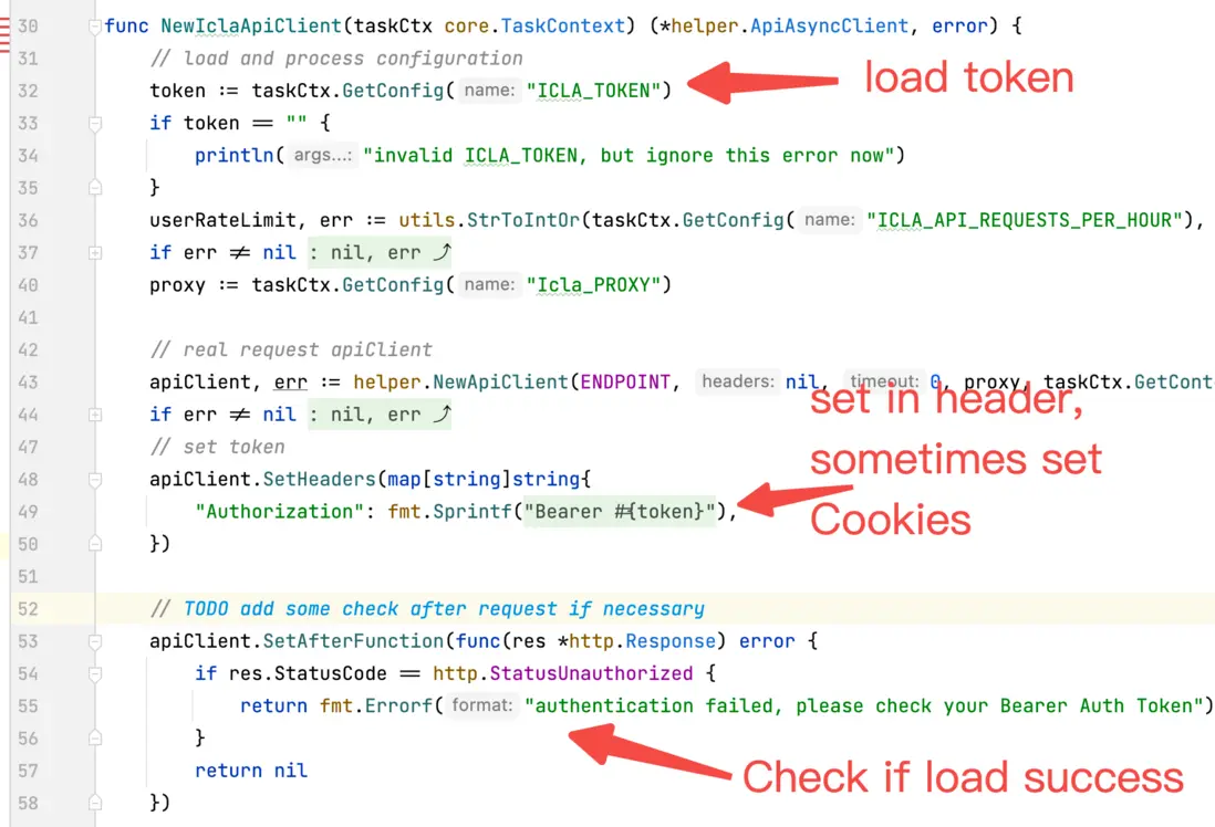 Let's look at api_client.go. NewIclaApiClient load config ICLA_TOKEN by .env, so we can add ICLA_TOKEN=XXXXXX in .env and use it in apiClient.SetHeaders() to mock the login status. Code as below: