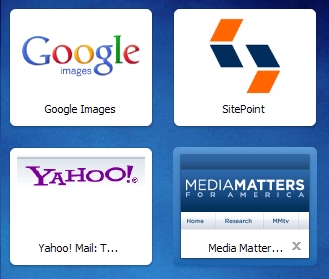 The visual benefits are apparent. Google Images and Yahoo use their colorful text as their brand identity. The Media Matters logo displays clearly, though it’s apparent that the “icon” is a nicely, and serendipitously, selected chunk of the top left quadrant of their display (you can see the slice of navigation bar in the icon, though I don’t think that detracts from the strong visual impact of the brand presentation). SitePoint, with the usage of their Apple icon displaying on the Speed Dial screen, probably makes the strongest impact. Very clean and strong, and instantly recognizable.