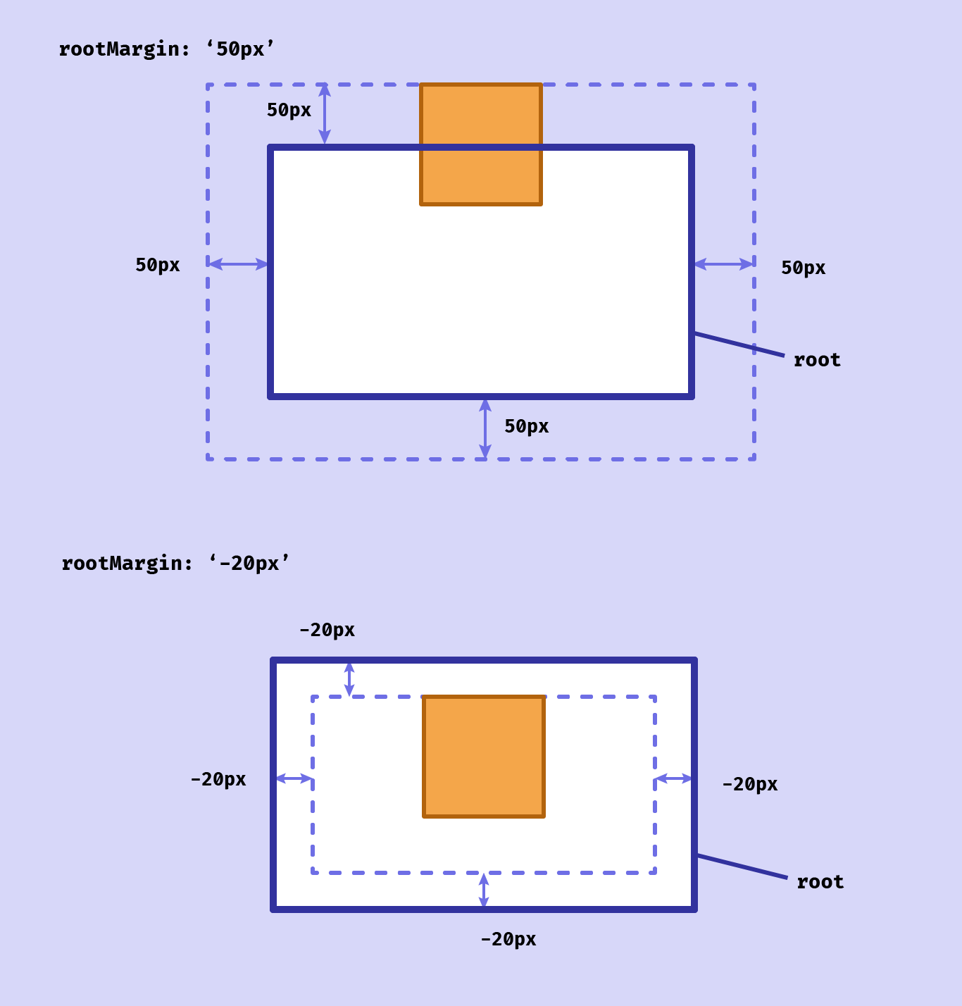 If no root is specified, then it will be classed as the browser viewport. The above code example shows the default values for both rootMargin and threshold. These can be hard to visualize, so are worth explaining: