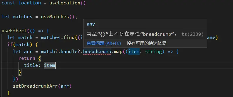 在使用react-router-dom的時候,用到了useMatches的方法,ts一直提示報錯,如下: