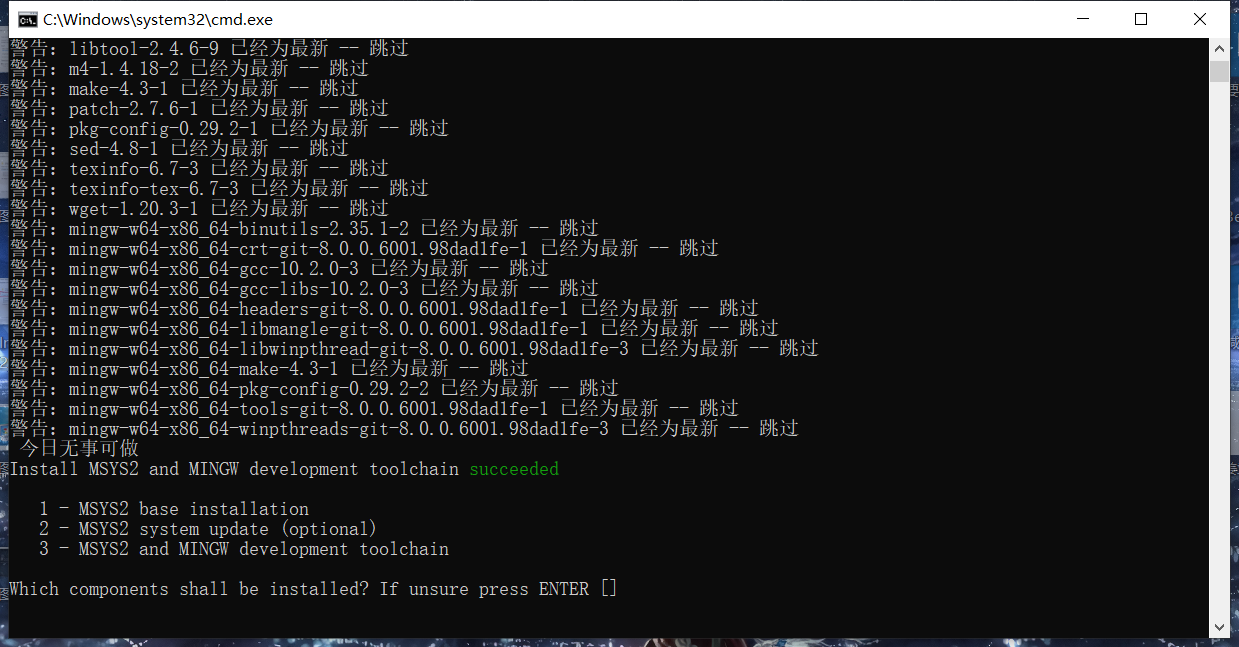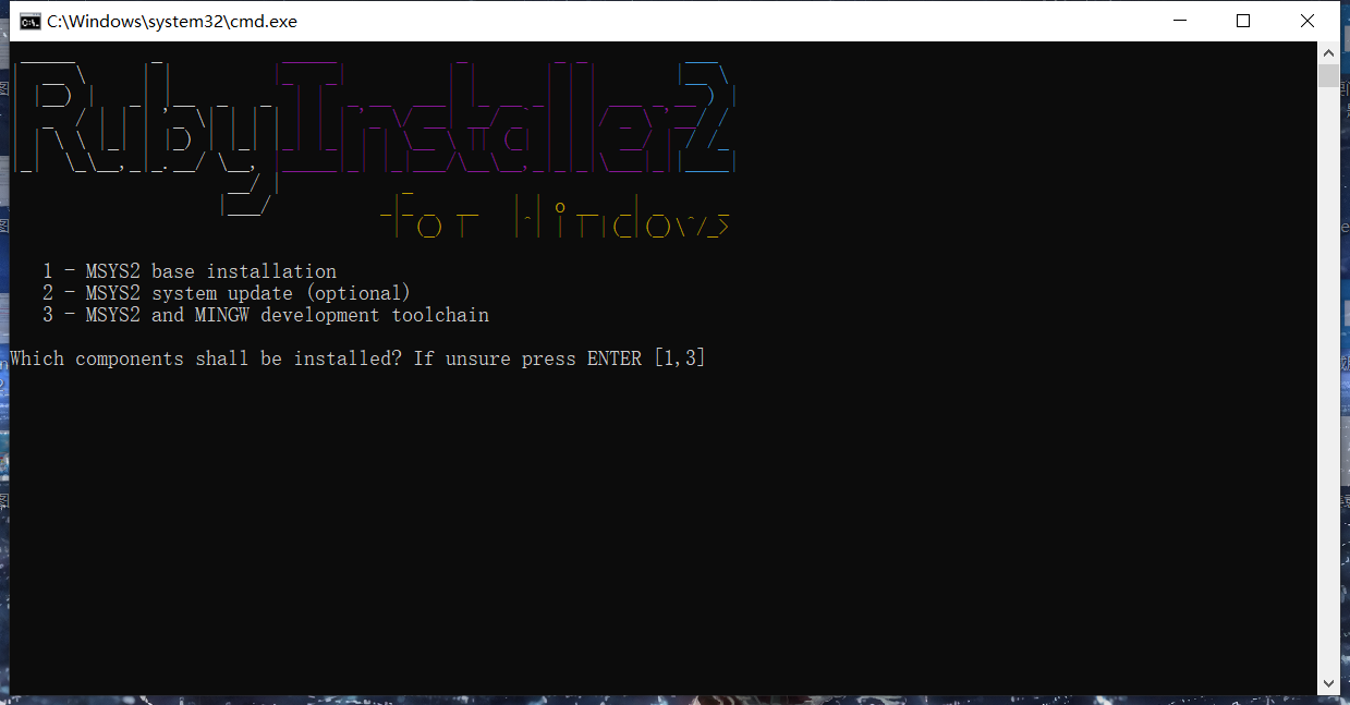 ruby安裝完成後,可以選擇安裝msys2,有三種安裝模式,也可以直接按回車選擇默認安裝:
