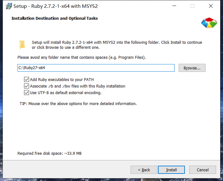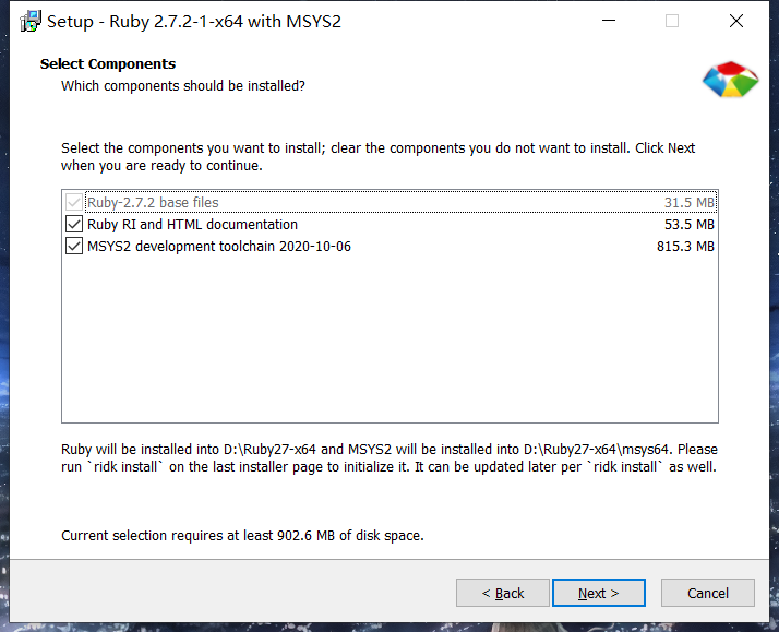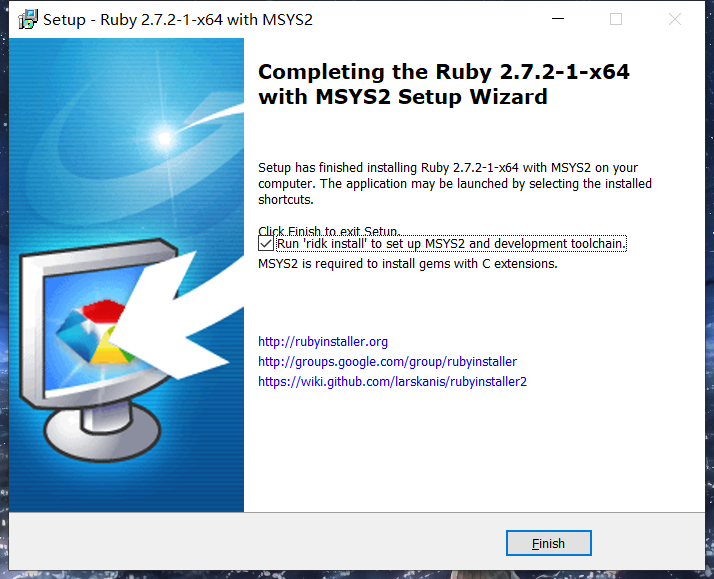 可以下載源碼編譯進行安裝,也可以下載相應的安裝工具進行安裝。博主下載的是windows平台下的ruby2.7.2(x64)+devkit的版本,可以同時安裝ruby和devkit,非常的方便。