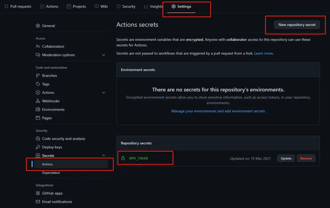 上面這個配置就是在每次創建一個release版本的時候,會自動將我們的代碼編譯打包,發佈到npm倉庫中去。需要提前配置好NODE_AUTH_TOKEN變量,npm_token可以去npm平台獲取,然後在GitHub倉庫的Settings裏面配置就行了。