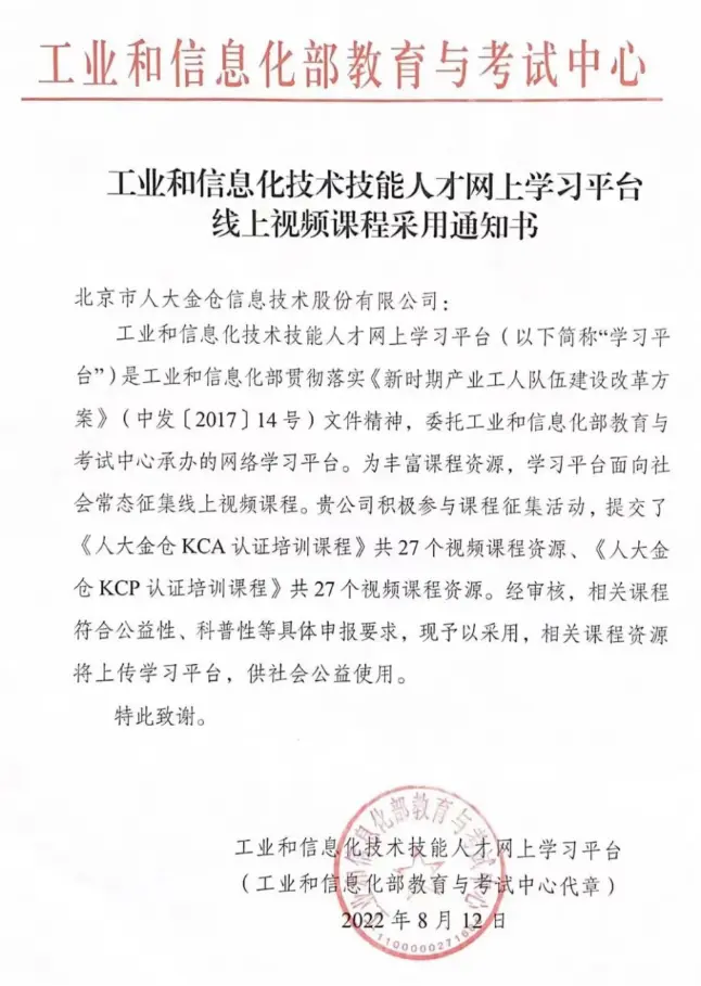 8月12日,人大金倉成功入選為“工業和信息化線上培養工程”合作單位。由金倉出品的《人大金倉KCA認證培訓課程》以及《人大金倉KCP認證培訓課程》已被工業和信息化部教育與考試中心採用,目前已上線工業和信息化技術技能人才網上學習平台。