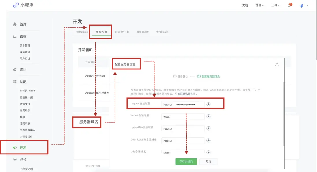 import uma from 'umtrack-wx' // **引入文件一定要放在此文件的最前面** uma.init({ appKey: 'your appKey', useOpenid: false, autoGetOpenid: true, debug: true }) Vue.prototype.uma = uma; - 增加友盟+數據服務域名