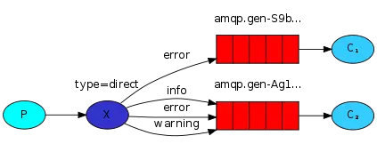 以上圖的配置為例,我們以 routingKey=”error”發送消息到 Exchange,則消息會路由到 Queue1(amqp.gen-S9b…,這是由 RabbitMQ 自動生成的 Queue 名稱)和 Queue2(amqp.gen-Agl…);如果我們以 routingKey=”info”或 routingKey=”warning”來發送消息,則消息只會路由到 Queue2。如果我們以其他 routingKey 發送消息,則消息不會路由到這兩個 Queue 中。